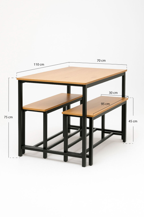 Set Bancos + Mesa Zane Altura mesa : 75 cm Ancho mesa : 110 cm Profundidad mesa : 70 cm Altura taburete : 45 cm Ancho taburete : 95 cm Profundidad taburete :... En stock. Envío en 5-7 días hábiles
