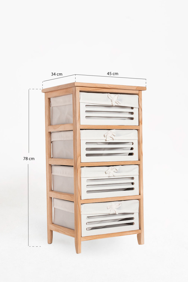 Los cuatro cajones ofrecen una distribución práctica para guardar ropa, material de oficina o complementos del día a día, mientras que el mueble mantiene una presencia visual equilibrada gracias a su diseño sobrio.