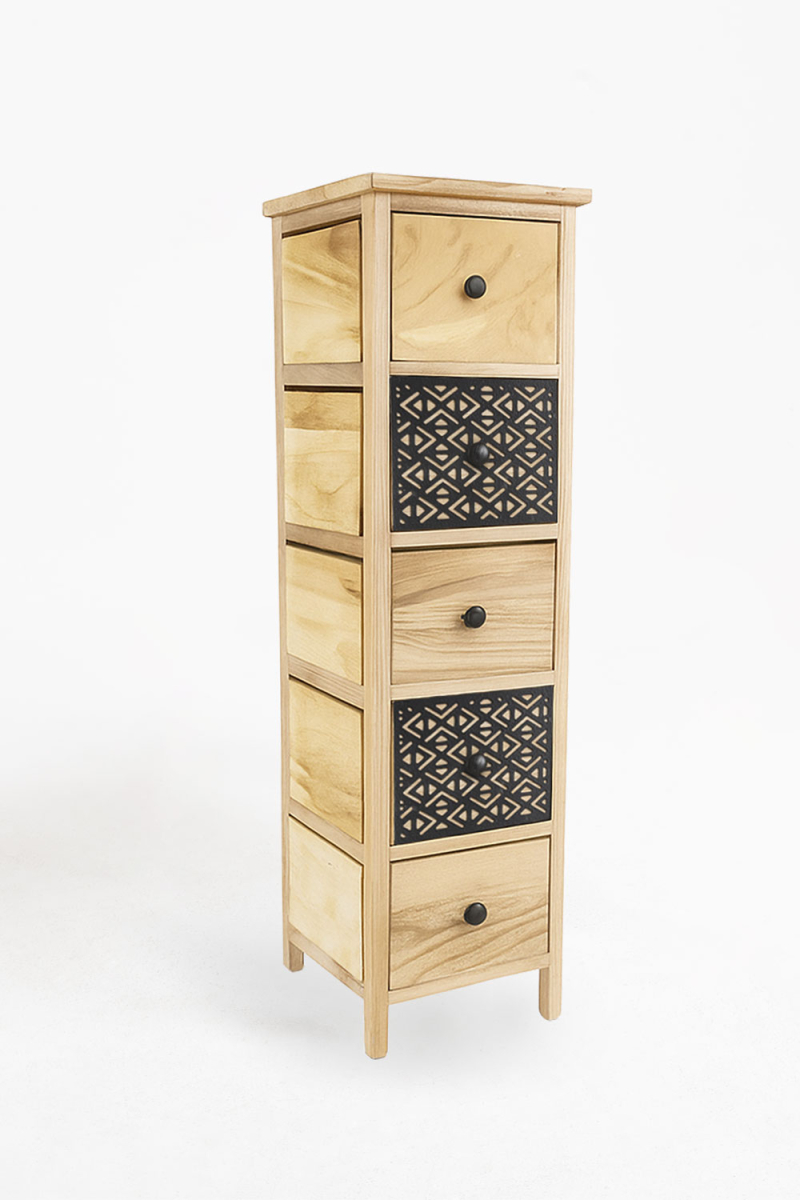 La Cajonera Estrecha Tidalon 5 Cajones es la solución ideal para quienes necesitan gran capacidad de almacenamiento en espacios estrechos. Con cinco cajones amplios en un formato vertical y reducido, este mueble auxiliar permite organizar ropa, papelería o accesorios sin sacrificar estilo ni ocupar mucho ancho.