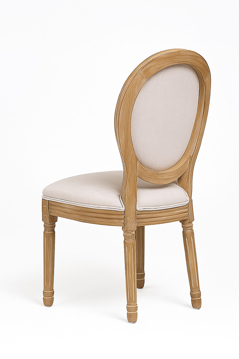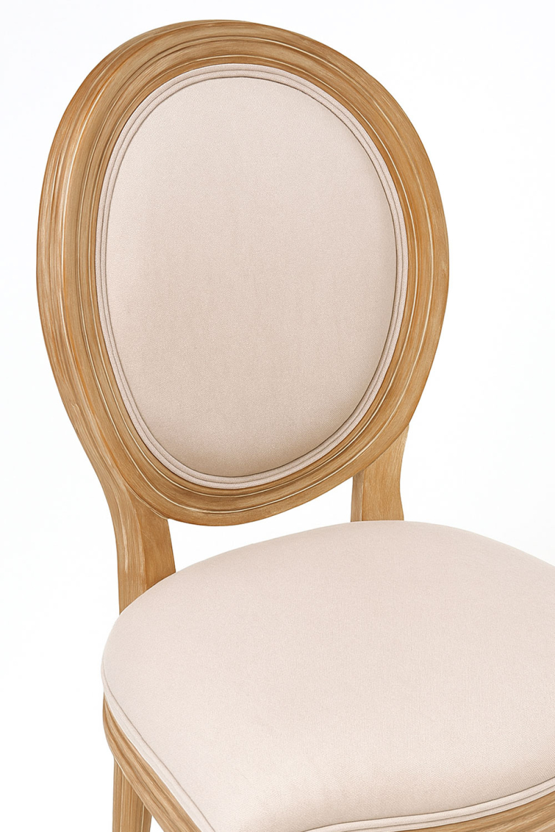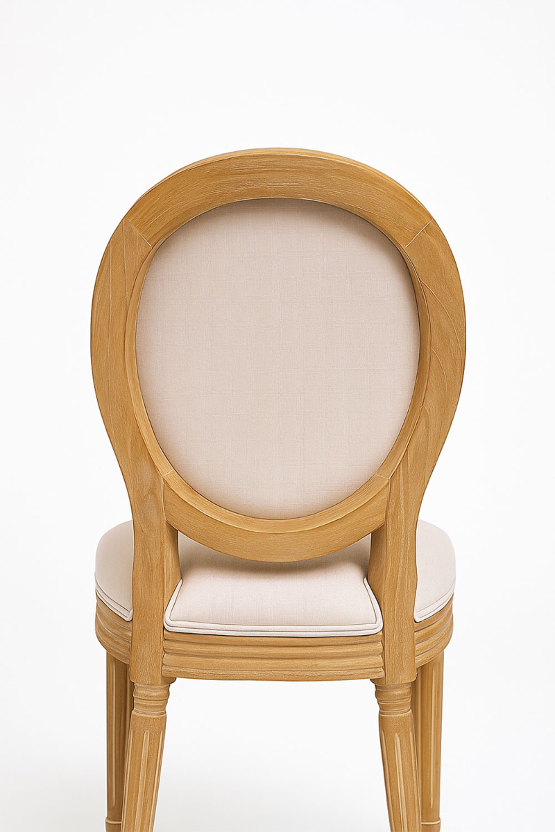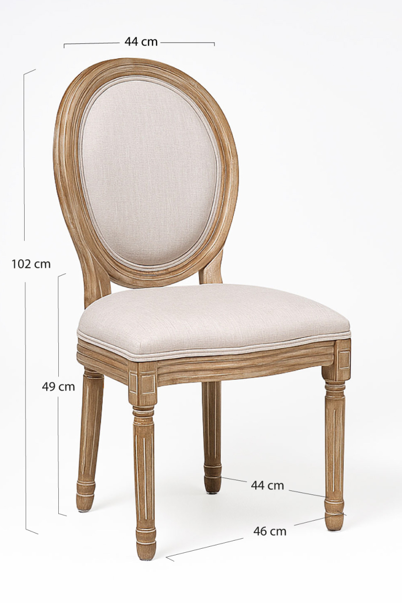 Pack 4 Sillas Palace: Si te gusta el estilo clásico porque sabes que es lo que está de moda, nuestra Silla Palace te va a sorprender.¿Por qué no convertir tu comedor o salón en un palacio? Así es el diseño de esta silla de estilo nórdico, en tonos claros y muy elegantes.Se trata de una silla fabricada con madera de olmo en su color natural y con el asiento de espuma forrado en tela beige.Es una silla manejable, de 102 centímetros de altura total y 6,5 kilogramos de peso, detalles que la hacen muy resistente, con la capacidad de soportar hasta 120 kilogramos de peso.Además, es muy cómoda, tanto en el respaldo como en el asiento, en los que puedes notar el efecto acolchado.Y te entrará por los ojos porque tiene esas sofisticadas formas palaciegas con el respaldo circular y unos elegantes acabados en la madera.