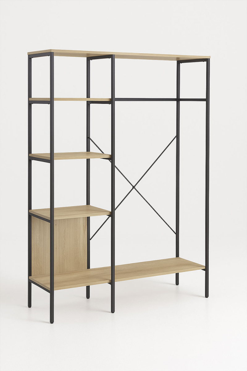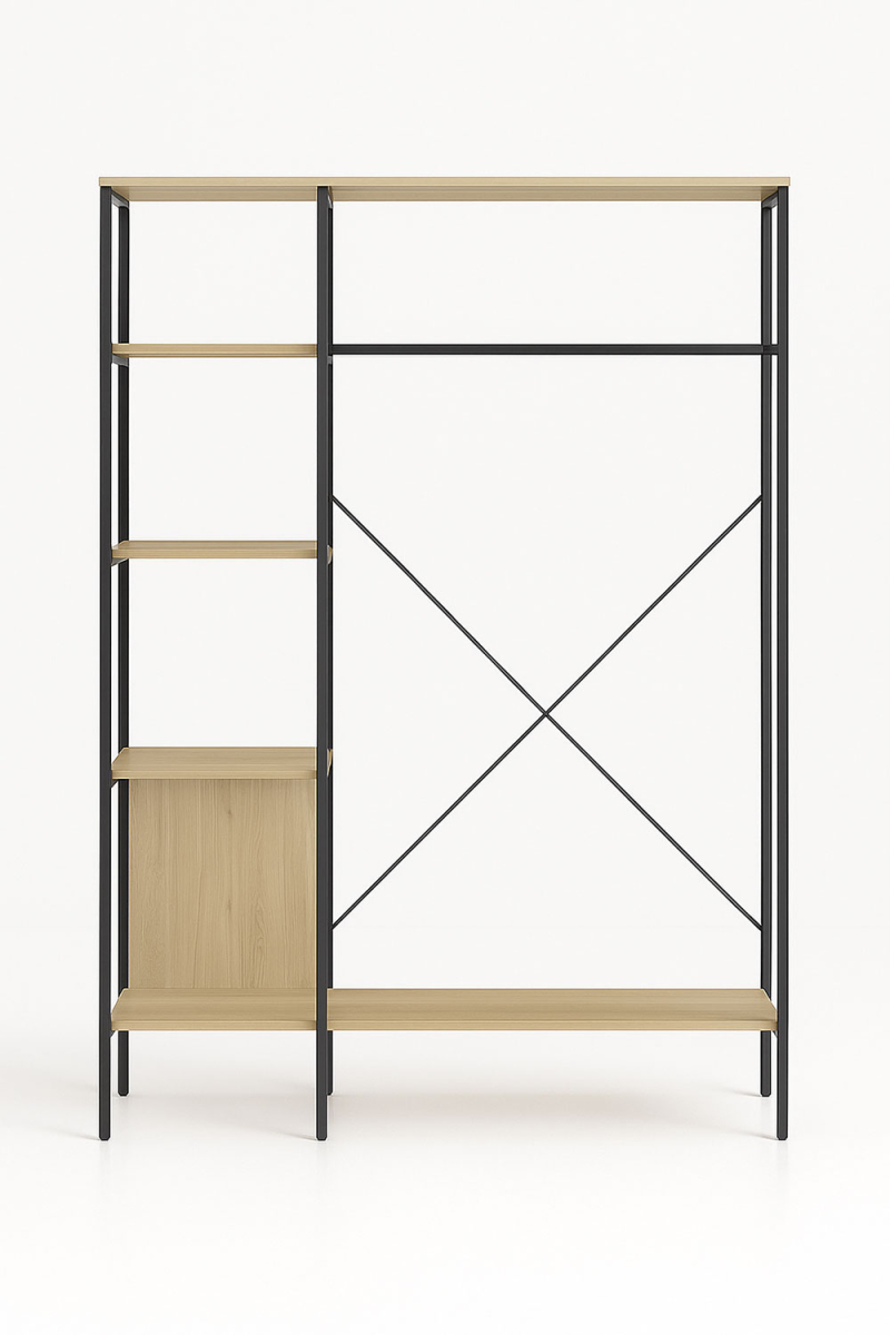 El Armario Mysan es una solución diseñada para quienes buscan combinar orden y estética sin renunciar al diseño contemporáneo. Su estructura metálica clara, junto con paneles o baldas de madera, ofrece una pieza versátil que funciona perfectamente como armario para dormitorio, vestidor o zona de trabajo en entornos domésticos o profesionales.