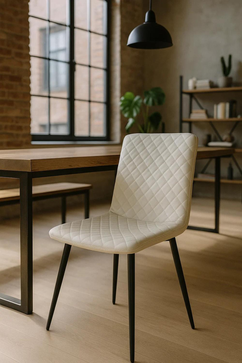 Se trata de una silla de estilo industrial fabricada en acero reforzado y con las patas en color negro. Su asiento, de tipo butaca y acabado en polipiel, es realmente cómodo y sofisticado, con detalles en forma de rombo que te resultarán muy atractivos. Además, la tienes disponible en 5 colores: Blanco, negro, gris, marrón arena y verde azulado.