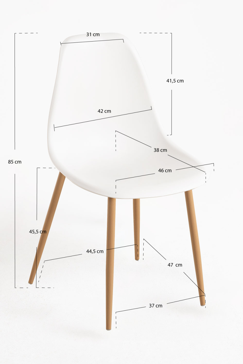 El asiento y el respaldo son una única pieza de polipropileno, un polímero muy resistente y muy utilizado entre los años 50 y 2000. Este material permite un acabado de elevada calidad, pero además fija muy bien los colores, de modo que está disponible en una amplia gama cromática. Un modelo muy versátil que se adapta a tus ambientes.