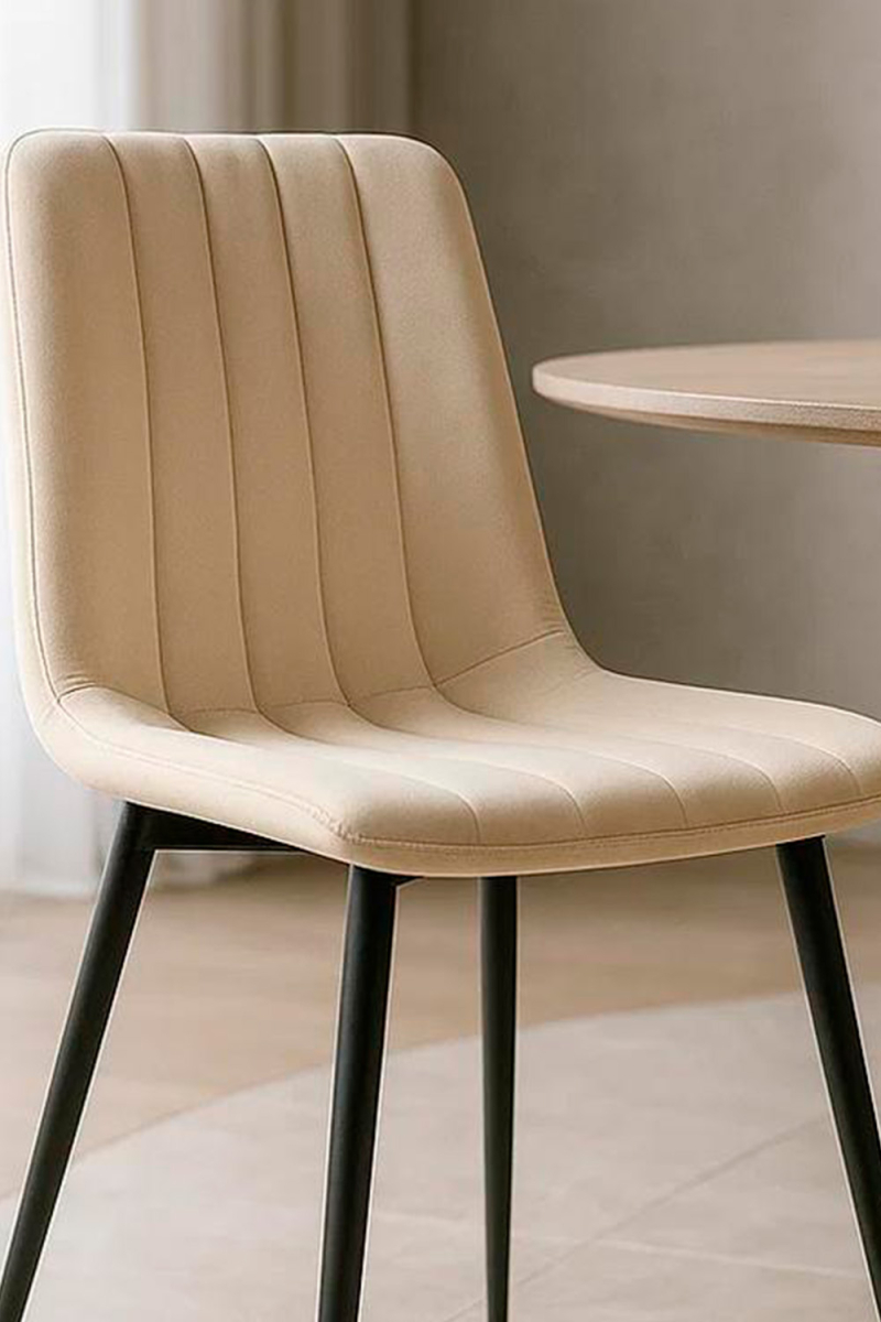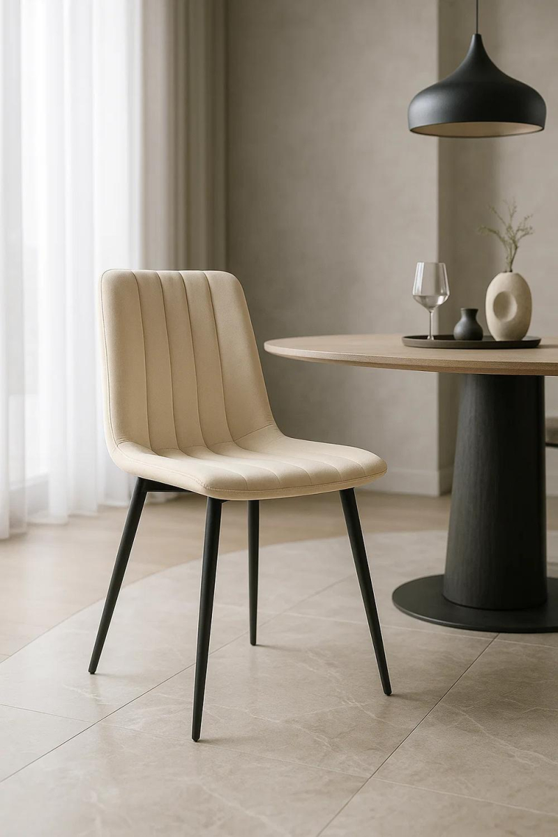 O seu assento de veludo oferece um toque suave e agradável, garantindo uma experiência de conforto no dia a dia. A sua ergonomia, com boa altura de assento e encosto, permite manter uma postura confortável durante as refeições ou reuniões.