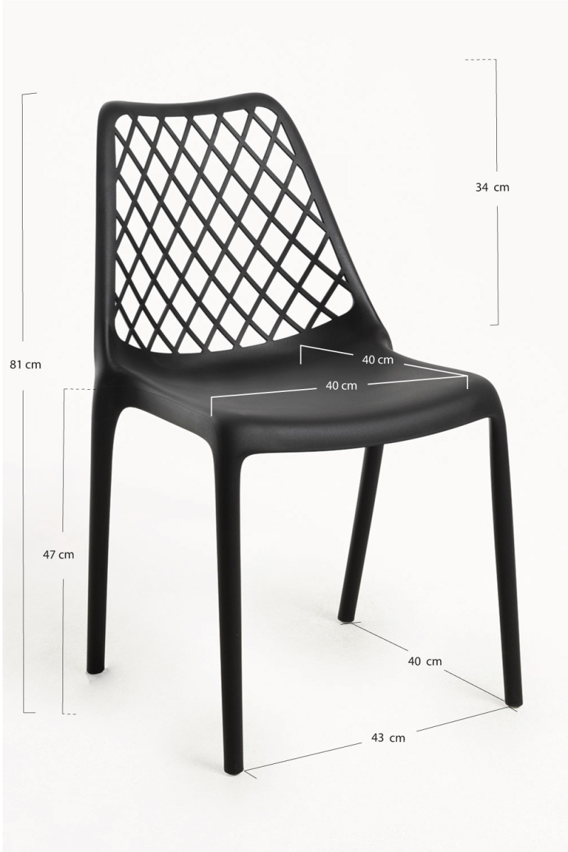 Polipropileno como material principal. El uso de este material en asiento y estructura aporta ligereza al conjunto y facilita el mantenimiento mediante una limpieza sencilla, especialmente útil en entornos exteriores.