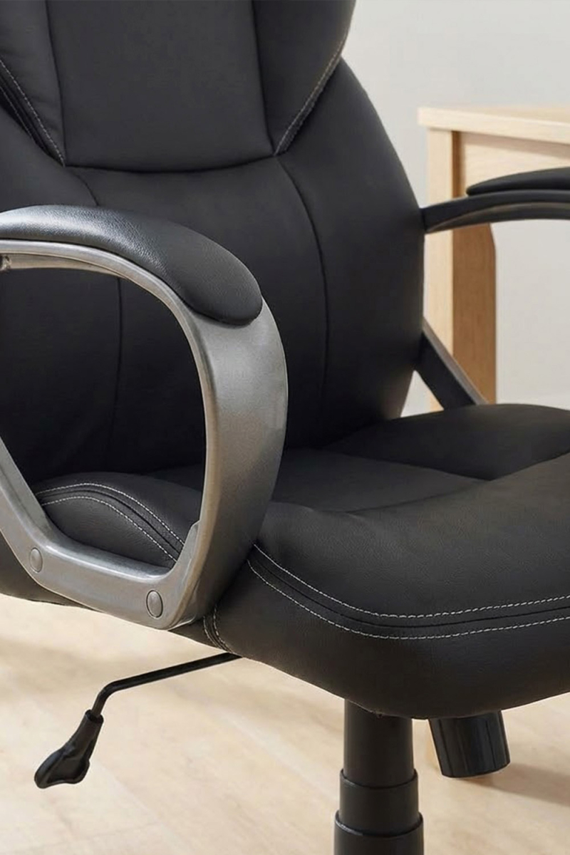 El asiento incorpora un relleno de espuma de alta densidad que proporciona una base firme y confortable, manteniendo una respuesta estable con el uso continuado. El recubrimiento en polipiel añade un tacto agradable y facilita la limpieza diaria, una ventaja práctica en espacios de trabajo de uso frecuente.