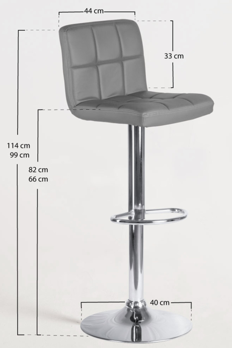 Con una altura total regulable entre 60 cm y 80 cm, este taburete permite adaptarse a diferentes tipos de barra y mesa alta. Su asiento de 36 cm de ancho y 42 cm de profundidad ofrece una superficie cómoda, mientras que su respaldo de 36 cm de ancho y 10 cm de alto proporciona un apoyo sutil. Sus patas de 38 cm de ancho y 38 cm de profundidad garantizan estabilidad, y su peso de 7,5 kg aporta firmeza y robustez.