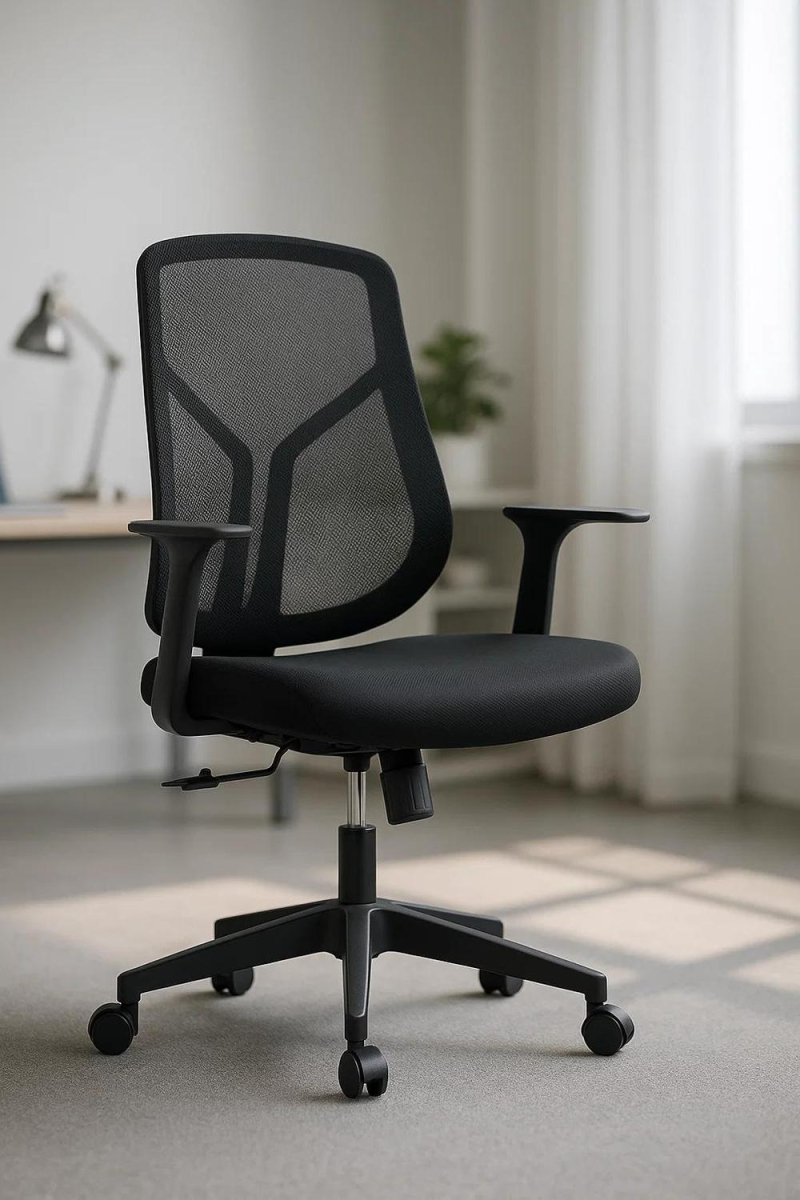 Proposta clara para o trabalho. A sua abordagem responde a quem procura uma cadeira com imagem profissional, materiais práticos e uma estrutura estável para tarefas de secretária em interiores.