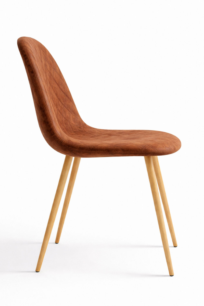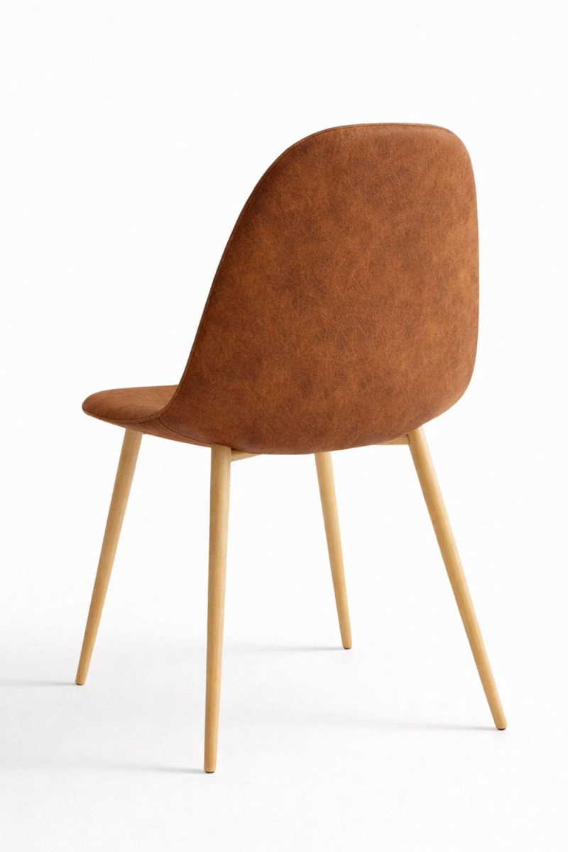 É uma cadeira com estrutura de aço reforçado e um acabamento de madeira para suas pernas. O assento é feito de espuma e couro sintético e possui um elegante acabamento em imitação de couro, o que lhe confere uma aparência muito bonita.