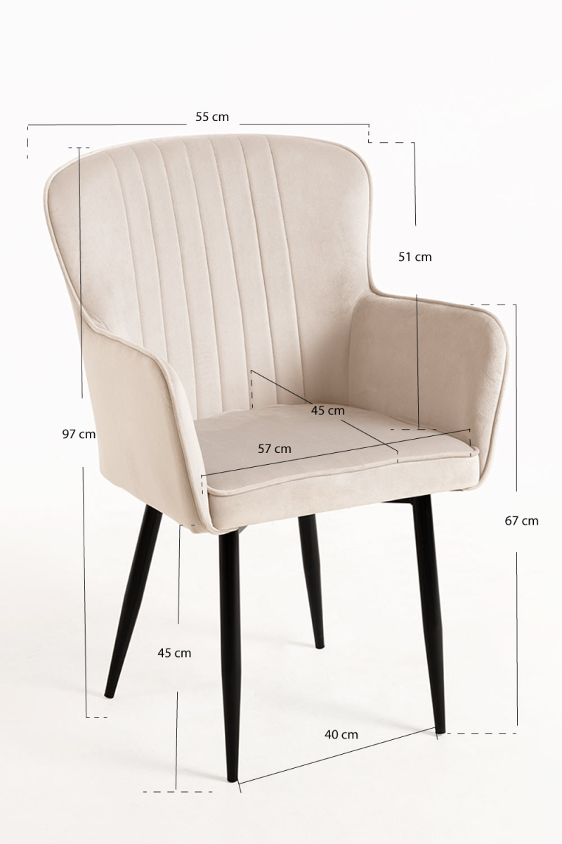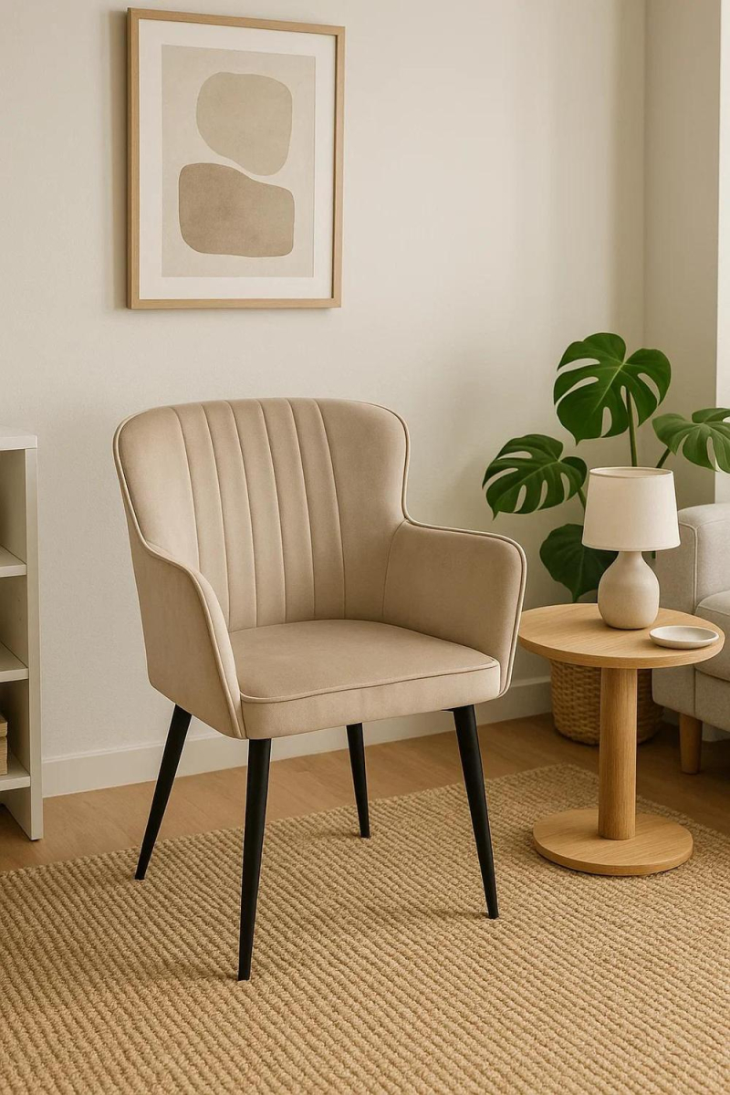 Esta cadeira destaca-se pelas suas linhas harmoniosas e uma silhueta que envolve suavemente, criando um estilo que aporta personalidade sem ser dominante. O estofado em veludo contribui com uma textura visual rica e um toque agradável, ajudando a criar um ambiente interior mais quente e definido, ao mesmo tempo que mantém uma estética contemporânea e elegante.