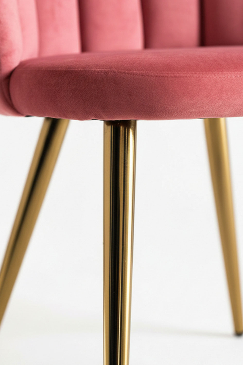 O veludo de alta qualidade, utilizado no assento, garante uma experiência confortável e luxuosa, enquanto as suas patas douradas com acabamento brilhante oferecem uma base resistente e um detalhe visual espetacular. A combinação destes materiais assegura uma cadeira que não é apenas funcional, mas também uma peça decorativa que valoriza qualquer espaço.