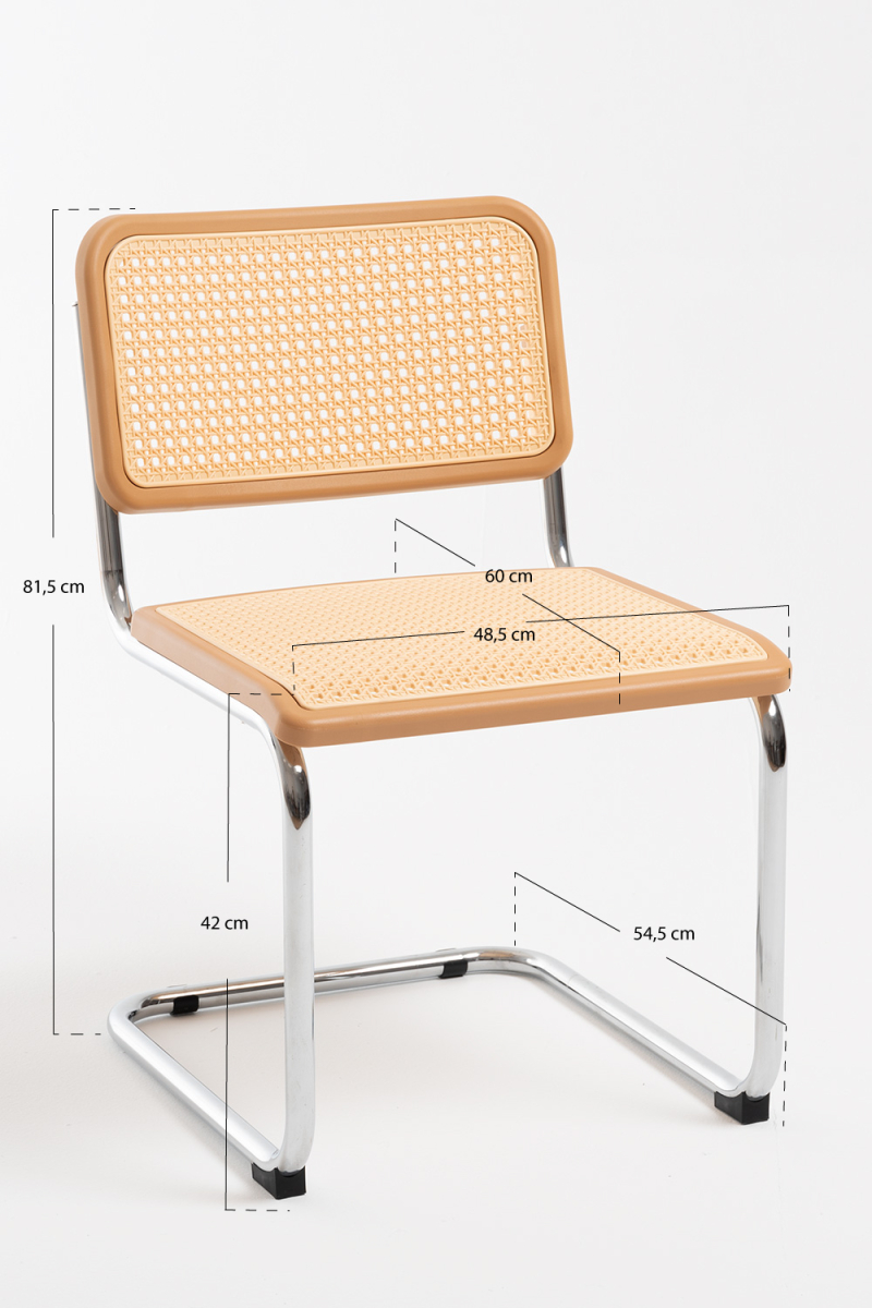 Antes de comprar, meça o seu espaço para garantir que a Cadeira Chrome Blony encaixe perfeitamente. As suas dimensões são 87 cm de altura, 42 cm de largura e 54 cm de profundidade, tornando-a adequada para mesas de sala padrão.