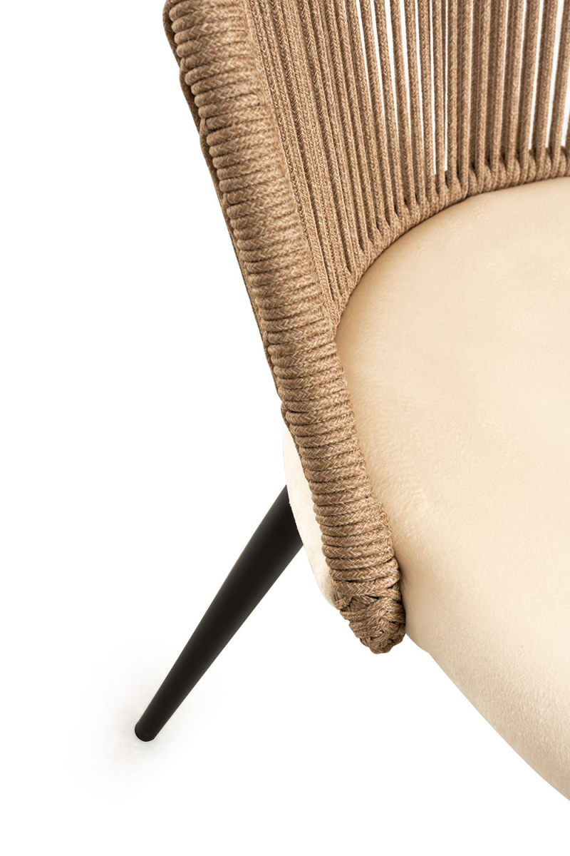 A Cadeira Misal é uma cadeira de jantar elegante que combina um assento estofado em Veludo com um encosto chamativo de Corda trançada, criando uma peça diferente para quem procura um toque distintivo na sua sala de jantar, quarto ou zona de trabalho em casa. O seu design encaixa-se perfeitamente em ambientes de estilo Veludo, boho ou vintage, trazendo calor e personalidade a qualquer espaço.