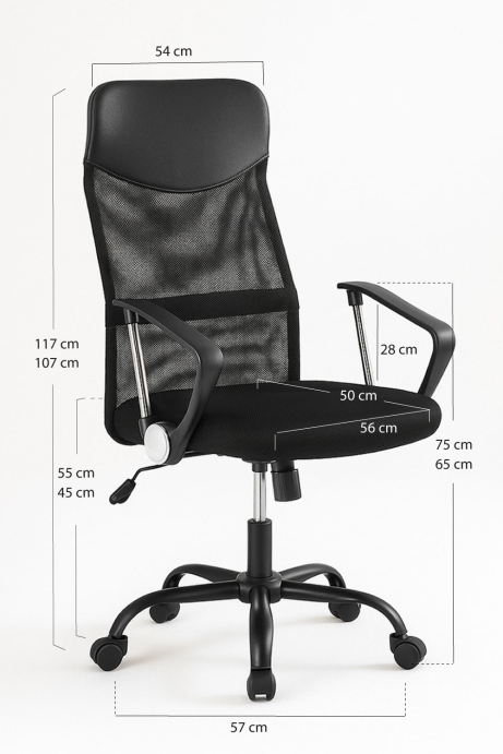 Cadeira Konva Preto Altura total máx. / min. : 125 cm / 115 cm. Profundidade : 61 cm. Largura : 63 cm. Material do assento : Tecido (poliéster respirável).... Em stock. Envio em 3 a 5 dias