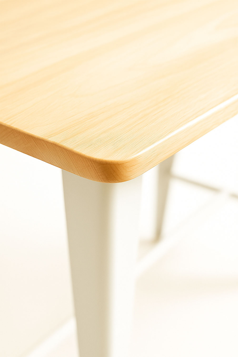 A mesa alta retangular de madeira natural está projetada para uso profissional e doméstico em espaços internos. É perfeita como mesa alta de jantar em lares com cozinha integrada, como mesa de apoio em bares de restaurantes ou como ponto de encontro em locais e cafeterias. Sua forma retangular facilita acomodar confortavelmente até 6 pessoas, criando um ambiente social e dinâmico ao redor do tampo.