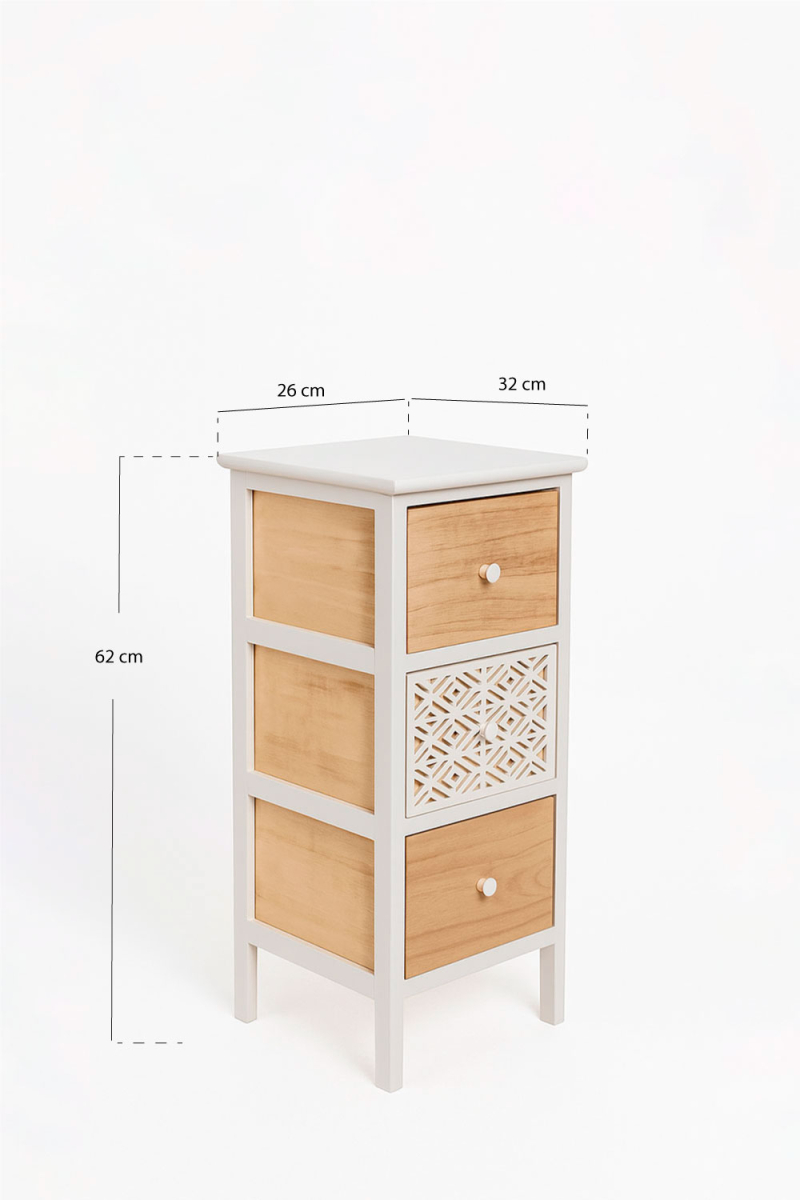 Móveis Auxiliares Tale 3 Gavetas Altura total : 62 cm. Largura : 25 cm. Profundidade : 33 cm. Peso : 3,5 kg. Material : MDF Local : Interior. Uso : Doméstico.... Em stock. Envio em 3 a 5 dias